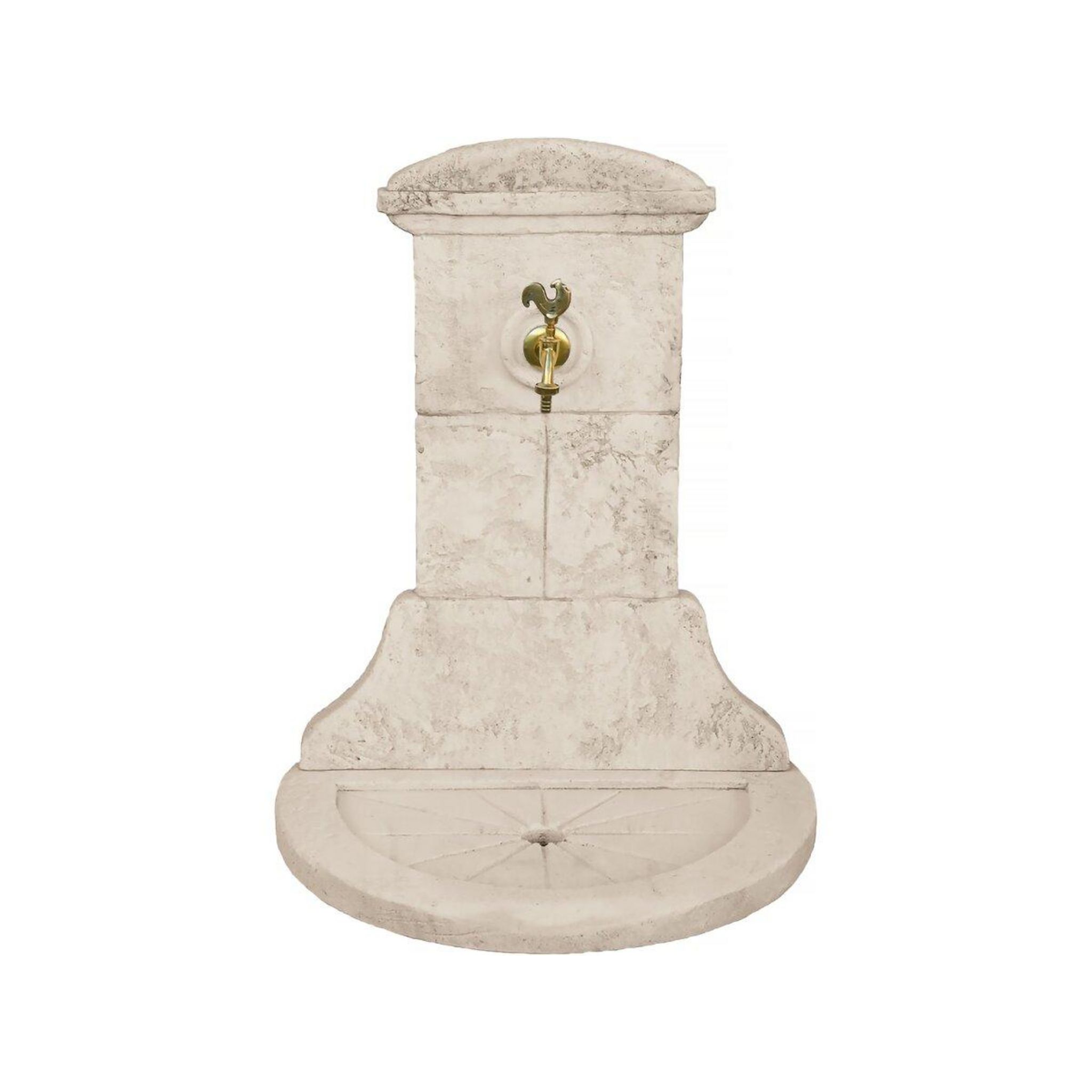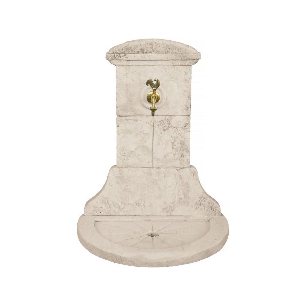 La fontaine estvendue avec un robinet en laiton.Description : Fontaine CHANTILLY - en pierre reconstituée composée d'un réceptacle et d'un fronton - Vendue avec un robinet en laiton - 60 x 42 x 94 cm.