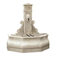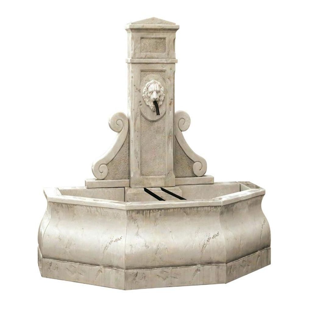 Fontaine Fontainebleau Nous vous proposons cette très belle fontaine de jardin en pierre reconstituée Fontainebleau, vous aurez le choix de l'adosser contre un mur ou pas. Elle est composée de 7 pans (qui constituent le bac), d'une colonne en 3 parties plus une Tête de lion . Fontaine Fontainebleau - 1.98 x 1.06 x 1.64 m - En pierre reconstituée imitant à la perfection l'aspect de la pierre naturelle. .Description: Livrée avec 1 bec verseur et 2 barres repose-seau en acier - Livrée avec colle et joints - Livrée avec pompe électrique.