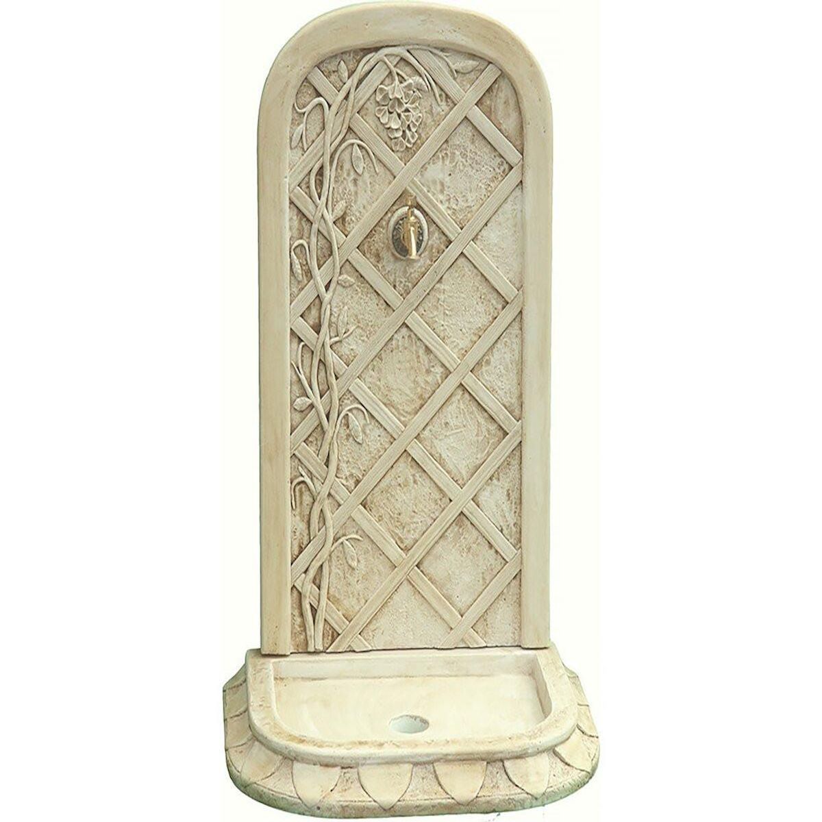 Fontaine Glycine Nous vous proposons la fontaine murale en pierre reconstituée Glycine. Idéal pour la décoration de votre jardin, ce matériau est très résistant aux conditions extérieures telles que la pluie, le gel ainsi qu'aux autres intempéries.Elle est composée d'un récéptacle avec trou d'évacuation et d'un fronton.Fontaine Glycine - 0.62 x 0.45 x 0.90 m - En pierre reconstituée imitant à la perfection l'aspect de la pierre naturelle. .Description: Vendue avec un robinet en laiton.