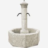 Fontaine Méridionale Nous vous proposons cette magnifique fontaine de jardin centrale en pierre reconstituée Méridionale, idéale pour les petits jardins. Elle est composée d'un bac en 4 parties à sceller sur une chape béton et d'une colonne en 3 parties, à sceller également. La boite de dérivation est prévue et se trouve en haut de la colonne centrale.Fontaine Méridionale + pompe électrique - Diamètre 122 cm x H.116 cm - 1 bac en 3 partie - 1 colonne centrale en 4 parties - 4 becs verseurs - 8 barres acier repose seau .Description: Fontaine vendue avec une boule et 3 becs verseurs en acier - Livrée avec colle et joints - Livrée avec pompe électrique.