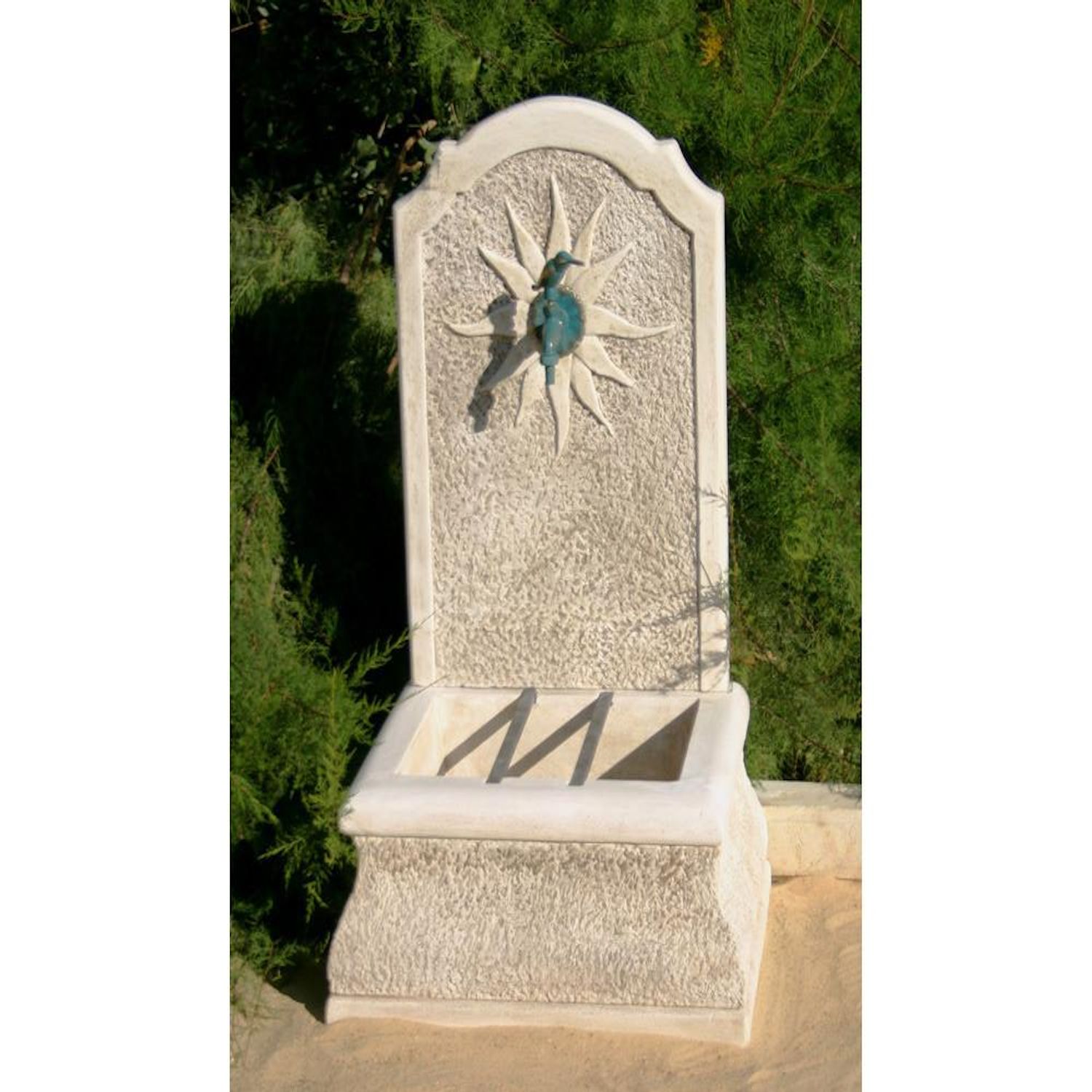 Fontaine Soleillade Nous vous proposons la fontaine de jardin en pierre reconstituée Soleillade.Idéal pour la décoration de votre jardin, ce matériau est très résistant aux conditions extérieures telles que la pluie, le gel ainsi qu'aux autres intempéries.Elle est composée d'un bac avec trou d'évacuation et d'un fronton.Fontaine Soleillade - L.60 x prof.45 x H.96 cm - En pierre reconstituée imitant à la perfection l'aspect de la pierre naturelle. .Description: Vendue avec 2 barres en acier plein et un robinet laiton.