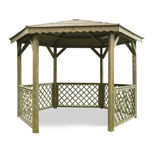 Kiosque en bois Pavilion - 6.68 m² - Dimensions extérieures au sol : 315 x 257 x 256 cm - 16 mm - Toiture en bois perméable.Remarques : - Vérifier que l'accès au point de livraison soit possible par une semi-remorque - Pas de livraison vers les îles sans pont avec le continent Descriptif : Kios