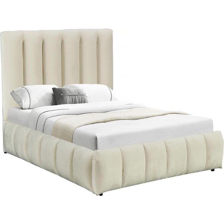 Lit double en velours avec coffre Annie - 180 x 200 cm - Coloris Beige - Sommier à lattes inclus - 24 lattes - Dimensions: 221 x 198 x 121 cm.
