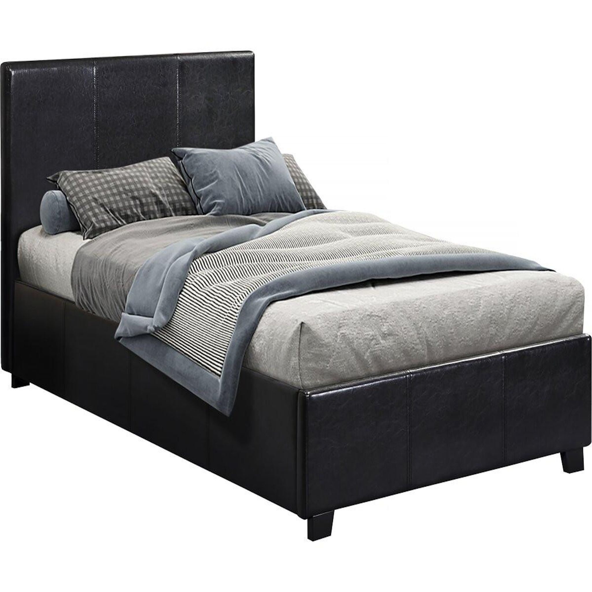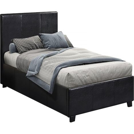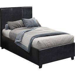 Lit PVC Carla noir - 1 personne - Dimensions lit : 203 x 97 x 86 cm- Dimensions matelas : 90 x 190 cm - Structure en contre plaqué - Pieds en bois - Recouvert de PVC - Sommier à lattes et tête de lit inclus - Coffre de rangement en toile inclus.