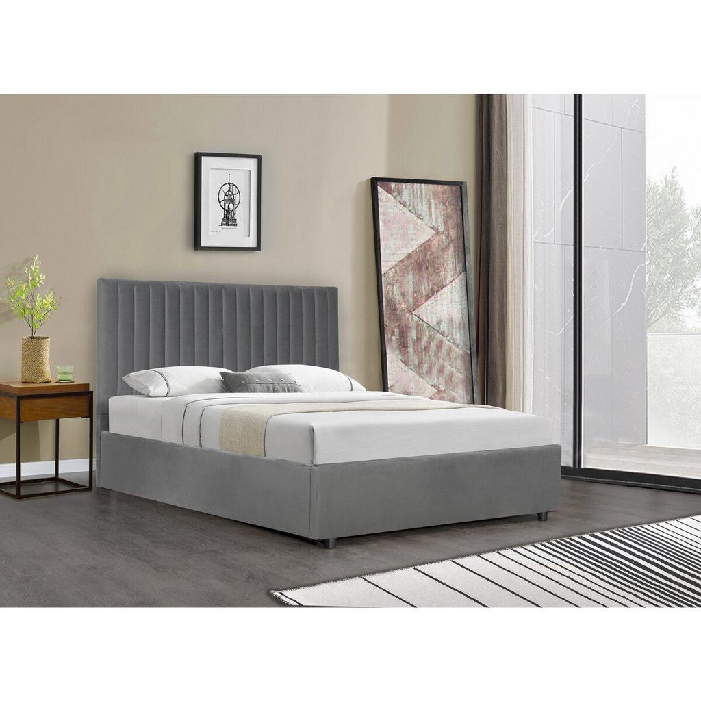 Lit double en velours avec coffre Mia - 160 x 200 cm - Gris - Coffre de rangement intégré - Velours - Tête de lit rembourrée..Lit Mia - 160 x 200 cm - Gris Le lit Mia est équipé d'un grand coffre de rangement intégré qui vous permet de ranger facilement vos couvertures, vos oreillers ou tout