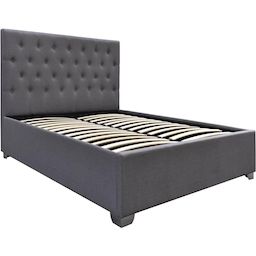 Lit double avec coffre TINO - Dimensions du lit : 217 x 168 x 108 cm - Dimensions du matelas : 160 × 200 cm - Gris - Structure : cadre en bois (contreplaqué et bois dur) - Tête de lit et pied de lit en tissu - Avec sommier à lattes en peuplier (bois courbé) - Matelas non inclus.