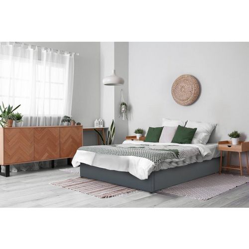 Descriptif : Lit double en PVC avec coffre Ava - Sommier à lattes - Coffre de rangement - 140 x 190 cm - Gris.