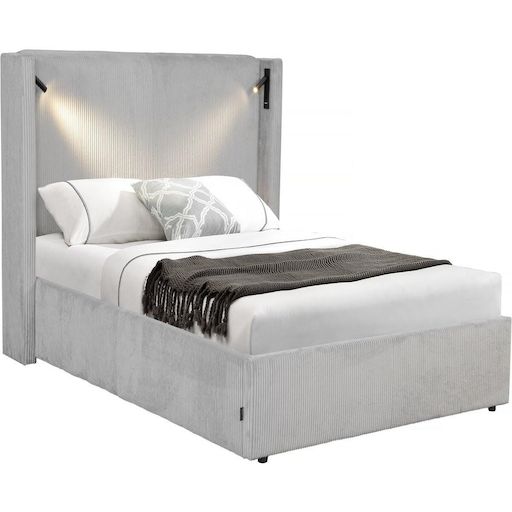 Lit coffre en velours côtelé multi fonction - Coffre, Lampes de lectures et prises USB intégrés - Dimensions 220 x 183 x 120 cm - Couleur beige.Lit en velours côtelé Cortina - GrisDécouvrez le lit coffre en velours côtelé, l'alliance parfaite entre élégance et praticité. Avec son design raffiné e