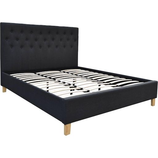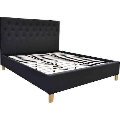 En savoir +Lit Emmy 2 personnes - Gris foncé - Dimensions lit : 218 x 187 x 102 cm - Dimensions matelas : 180 x 200 cm - Structure en bois - Pieds en bois - 100% polyester - Sommier à latte et tête de lit inclus.