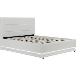 Lit avec LED Anastasia Un lit design et solideLe lit 2 places Anastasia est doté d'un design à la fois moderne et sobre.Enveloppé de lin, sa structure est un savant mélange de MDF et de contreplaqué, pour un lit véritablement robuste et stable.Le lit Anastasia est également pourvu d'une tête de lit stylisée.Elle sert autant à apporter un charme indéniable à une chambre et à lui donner plus de caractère, qu'à vous proposer un support dorsal confortable pour lire un bon bouquin ou pour regarder un film avant d'aller dormir. Personnalisez votre chambreDe plus en plus demandé, le lit à éclairage LED est devenu très populaire.Son subtil éclairage permet de créer une ambiance personnalisée dans sa chambre à coucher.Selon vos goûts, ce lit LED peut vous être utile si vous avez besoin d'une légère veilleuse, d'un éclairage tamisé ou si vous vous sentez d'humeur festive.L'éclairage LED est d'une teinte blanche/bleutée. Pensez pratiqueLe lit double Anastasia dispose d'un coffre de rangement et vous apprécierez très vite cet espace supplémentaire dans votre chambre. Le fond du coffre se compose d'une toile fixée par du Velcro.Grâce à sa grande taille, le coffre de rangement de ce lit vous permet d'y ranger tout ce dont vous avez besoin, notamment en literie.En effet, vous pourrez l'utiliser pour ranger des draps, des housses de couette des coussins supplémentaires et même des parures de lit. Très pratique, surtout pour une chambre d'amis. Recevez tranquillement vos proches pour la nuit, tout le nécessaire se trouve à portée de main ! Lit avec LED Anastasia - Blanc - Dimensions matelas : 140 x 190 cm - Dimensions lit : 151 x 203 x 90.5 cm - MDF + Bois + PVC - Tête de lit fournie - Coffre de rangement - Avec sommier à lattes - Matelas en option .Descriptif: Lit 2 places