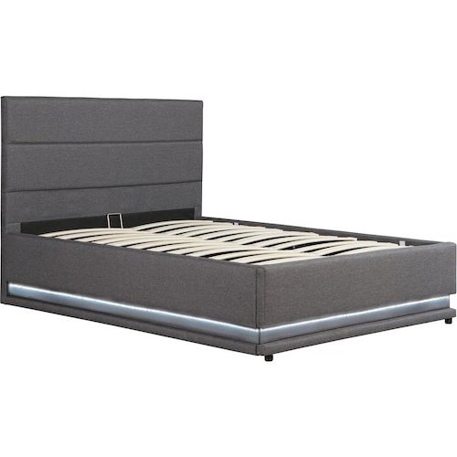 Lit avec LED Anastasia - Gris foncé - Dimensions matelas : 140 x 190 cm - Dimensions lit : 151 x 203 x 90.5 cm - MDF + Bois - Lin - Tête de lit fournie - Coffre de rangement - Avec sommier à lattes - Matelas en option.