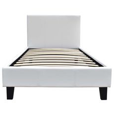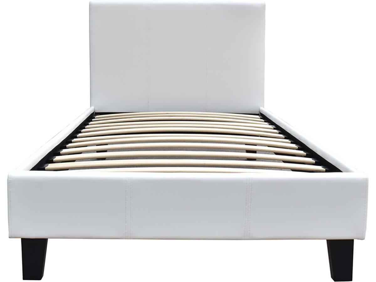 Descriptif : Lit Lina 1 place 90 x 190 cm Structure solide Habillage en PVC Garnissage en mousse d'une densité de 18 kg/m³ Sommier à lattes Tête de lit Matelas non fourni Supporte jusqu'à 150 kg Blanc.