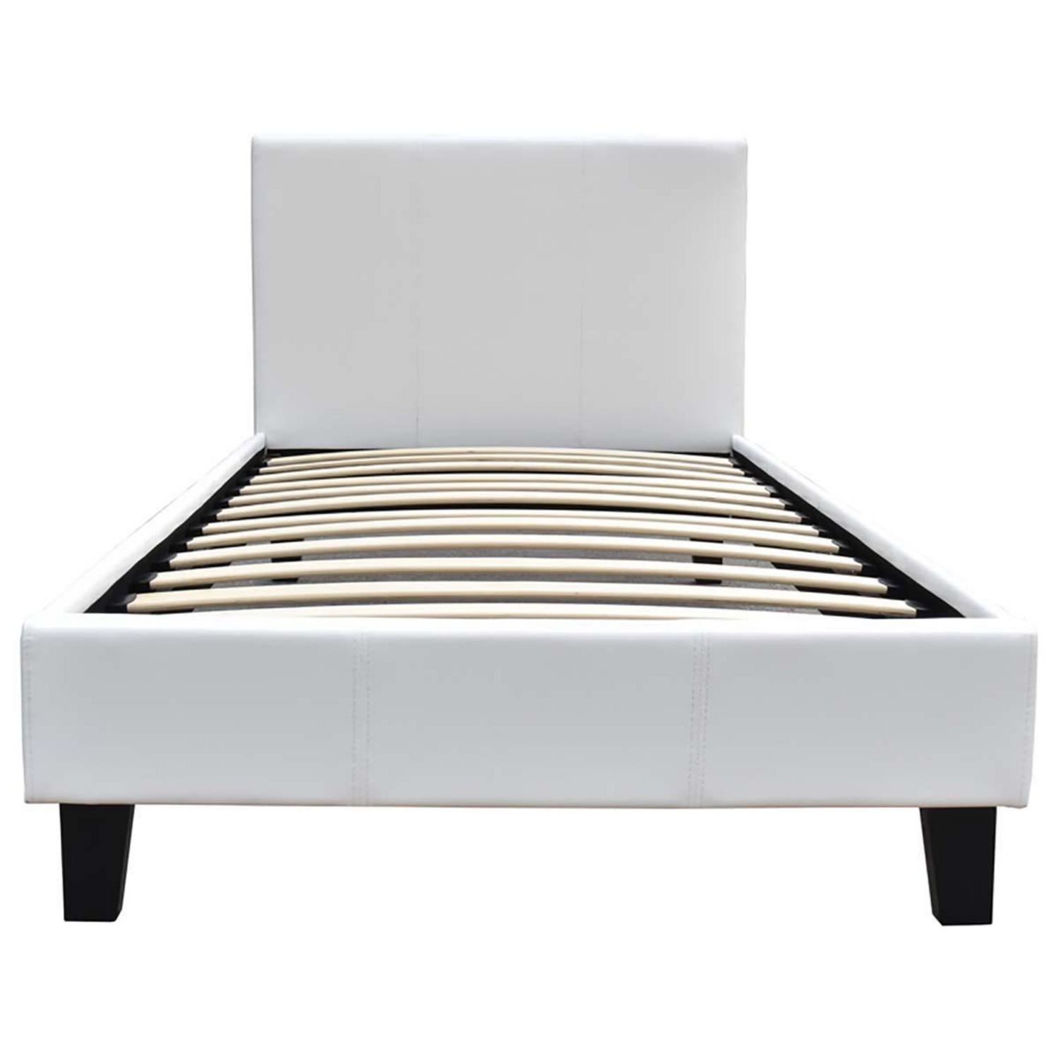 Lit Lina 1 personne - Blanc - Dimensions : 202 x 97 x 86 cm - Dimensions matelas : 90 x 190 cm - Structure et pieds en bois - Recouvert de PVC - Sommier à lattes et tête de lit inclus.