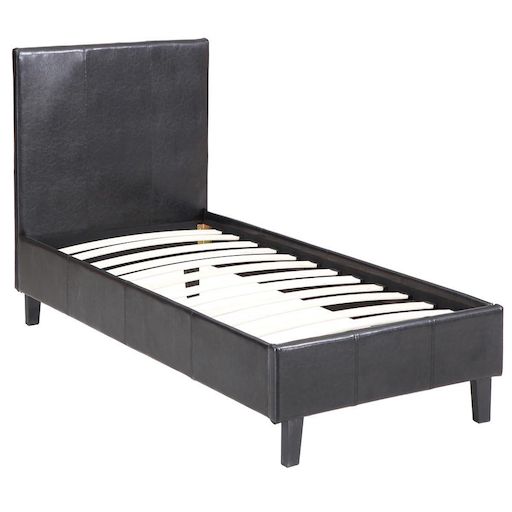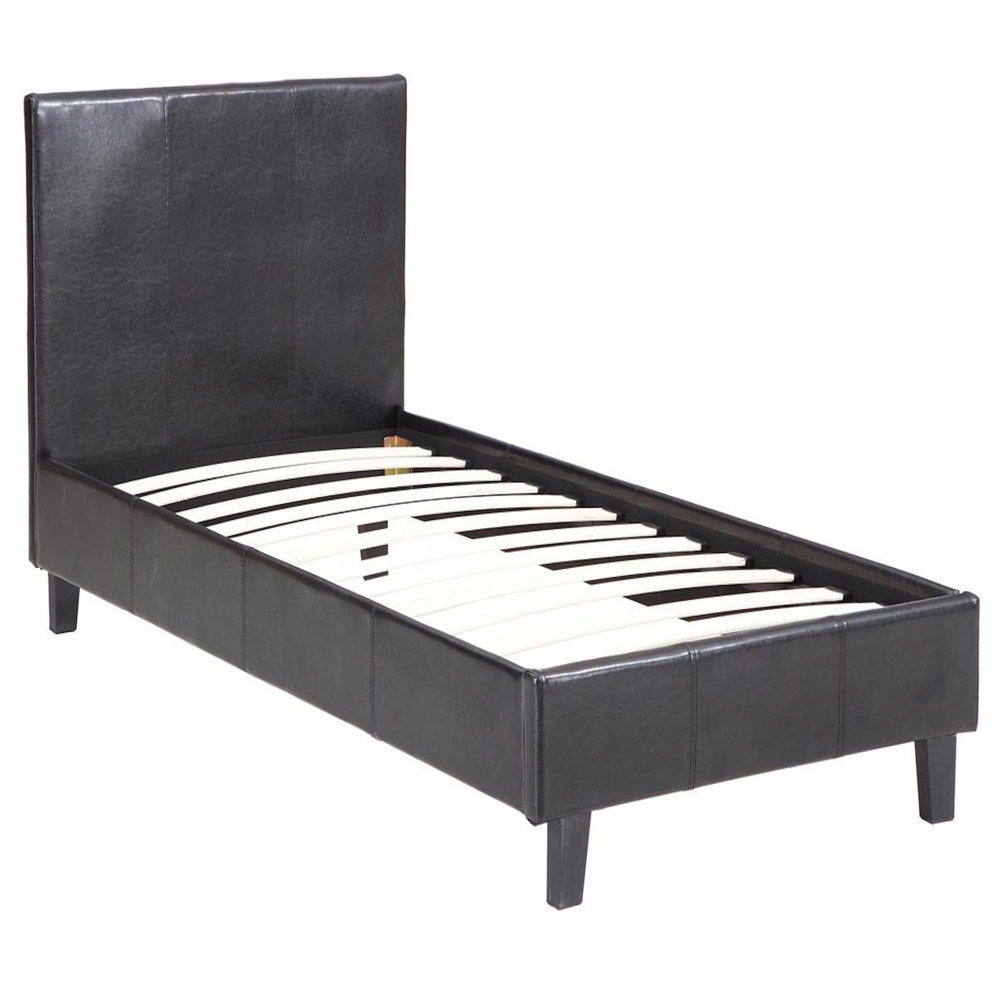 Lit Lina 1 personne - Noir - Dimensions : 202 x 97 x 86 cm - Dimensions matelas : 90 x 190 cm - Structure et pieds en bois - Recouvert de PVC - Sommier à lattes et tête de lit inclus.