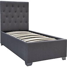 Lit simple avec coffre TINO - Dimensions du lit : 207 x 98 x 108 cm - Dimensions du matelas : 90 × 190 cm - Gris - Structure : cadre en bois (contreplaqué et bois dur) - Tête de lit et pied de lit en tissu - Avec sommier à lattes en peuplier (bois courbé) - Matelas non inclus.Lit Tino Le lit simp