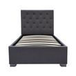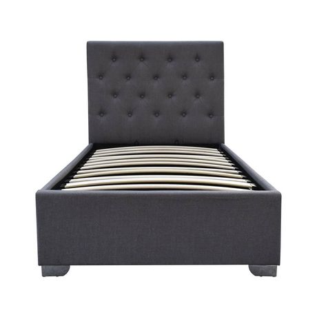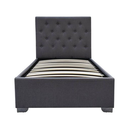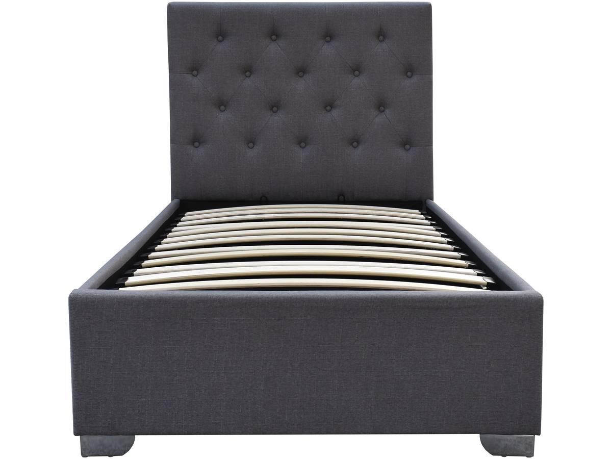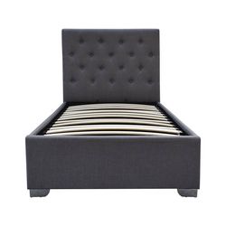 Lit simple avec coffre TINO - Dimensions du lit : 207 x 98 x 108 cm - Dimensions du matelas : 90 × 190 cm - Gris - Structure : cadre en bois (contreplaqué et bois dur) - Tête de lit et pied de lit en tissu - Avec sommier à lattes en peuplier (bois courbé) - Matelas non inclus.Lit Tino Le lit si