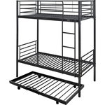 Le lit superposé Adam – 2 x 1 place est entièrement conçu en métal pour offrir une structure moderne, robuste et durable. Grâce à sa conception renforcée, il assure stabilité, longévité et sécurité au quotidien, ce qui en fait un choix parfait pour une chambre d'enfant, d'ado ou une chambre d'amis.En plus de ses 2 véritables espaces de couchage, ce modèle se distingue par son tiroir supplémentaire à roulettes, idéal pour créer un troisième couchage d'appoint. Parfait pour recevoir un invité à la dernière minute, optimiser l'espace ou aménager une chambre partagée sans encombrer la pièce.Compact, pratique et intelligent, le lit superposé Adam permet de gagner un maximum de place tout en offrant une solution de sommeil polyvalente et confortable. Il est particulièrement apprécié dans les chambres où chaque mètre carré compte, tout en garantissant un style contemporain et harmonieux. Lit superposé avec tiroir sommier Adam en acier - 3 x 1 place - Noir - Dimensions : 200 x 97,5 x 165 cm - Echelle fournie .Descriptif: Barrière de sécurité pour le lit du haut