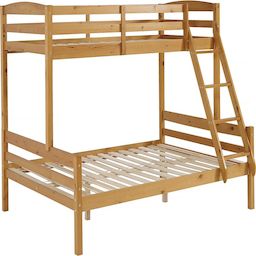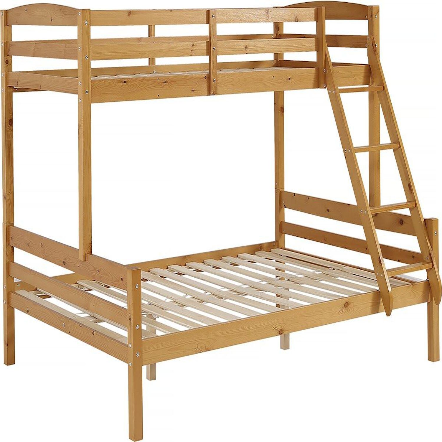 Lit superposé double Léa - 198 x 144 x 151 cm - Structure : Bois de pin - Lit 2 places en bas - Lit 1 place en haut avec barrière de sécurité - Marron.