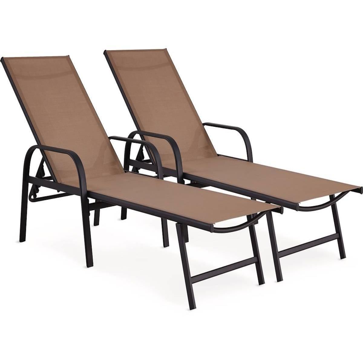 Lot de 2 Bains de soleil en métal Farniente Découvrez notre lot de 2 bains de soleil Farniente indémodable, parfait pour profiter de votre espace extérieur et vous reposer. Confortable et résistant, ce transat est parfait pour se détendre et pour relâcher la pression. Légers et robustes ils sont faciles d'entretien.Craquez pour notre bain de soleil qui s'adaptera à coup sûr à votre extérieur grâce à son design tendance !Il est également disponible en plusieurs coloris. Lot de 2 Bains de soleil Farniente - Dimensions : 193 x 59.5 x 45-102.5 cm - Matière : métal - Structure noir + Toile Taupe .Structure: Noir