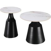 Tables basses gigognes Vulca - Lot de 2 - Dimensions grande table basse : 70 x 70 x 43 cm - Dimensions petite table basse : 50 x 50 x 48 cm - Plateau en céramique - Epaisseur du plateau : 1 cm - Effet marbré - Blanc.