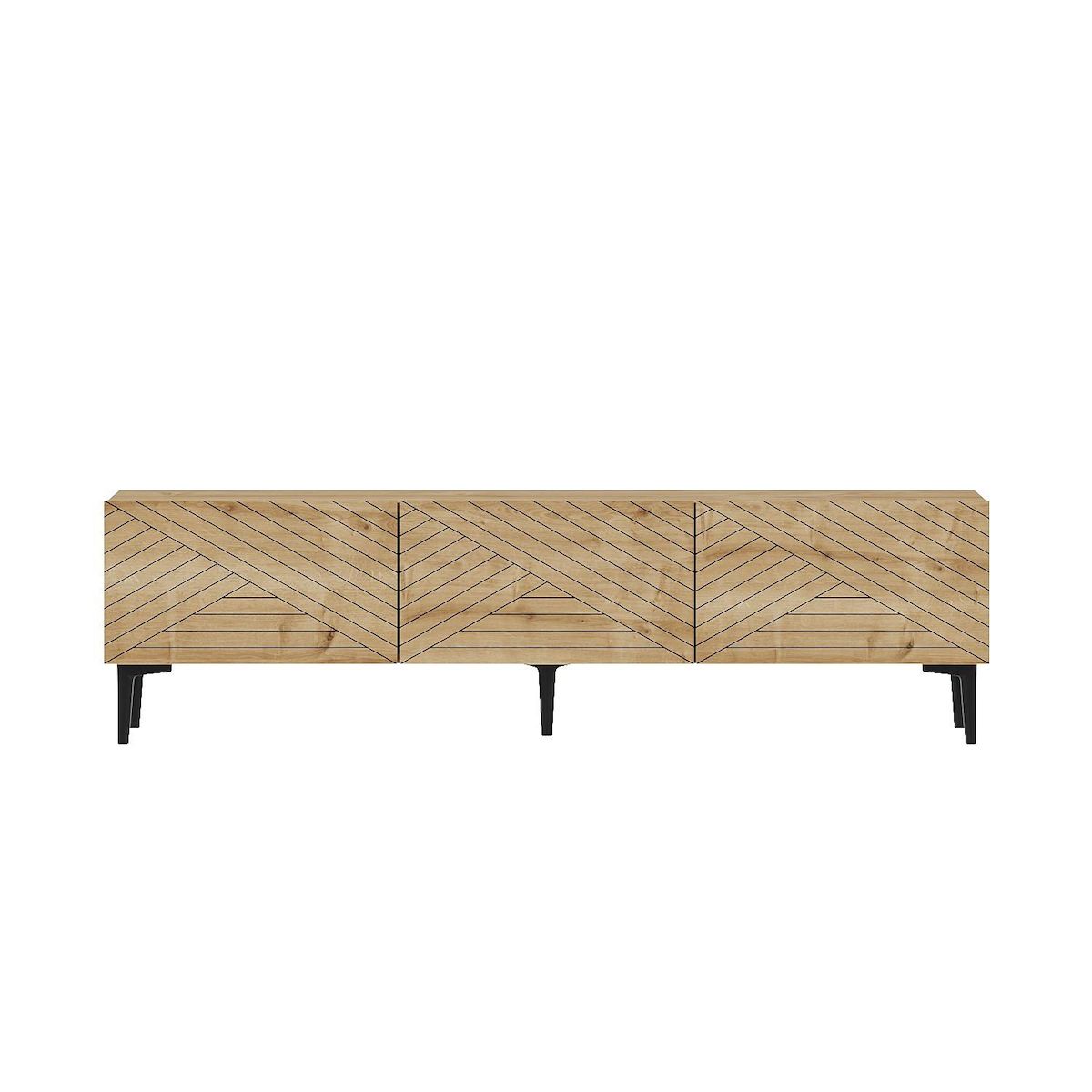 Meuble TV moderne en chêne saphir, 160 cm x 44,1 cm x 31,4 cm. Panneaux de particules 100 % mélaminés, épaisseur 18 mm. Design géométrique élégant, idéal pour le salon et les espaces multimédias..