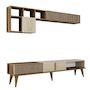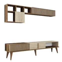 Ensemble meuble TV mural Milan - 180 x 35 x 40 cm - Noyer, Travertin – 5 étagères, 4 portes.