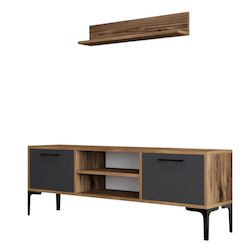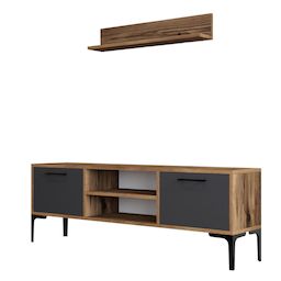 Meuble TV en bois Riga - 140 x 30 x 48 cm - NoyerAnthracite – 2.0 étagères, 2.0 portes Conçu pour offrir praticité et robustesse, ce modèle s'intègre facilement dans tout intérieur et répond aux besoins du quotidien en garantissant confort d'usage..