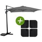 Parasol jardin déporté Soleil - Carré - Dimensions : 2.5 x 2.5 m - Gris - Structure : aluminium, acier (pieds) - Matière de la toile : polyester - Peut basculer - Peut pivoter à 360° - Anti-UV (30+) - Anti-rouille - Résiste à l'eau - Garantie 1 an - Pied de parasol : 4 dalles à lester incluses.Par