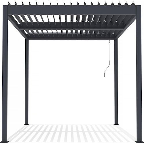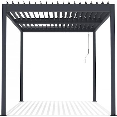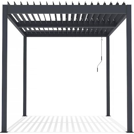 Pergola Bioclimatique Winsor en aluminiumLa pergola est la solution idéale pour votre patio ou votre terrasse. C'est l'extension parfaite pour profiter de votre extérieur.Cette tonnelle en aluminium est un véritable abri de vie en plein air. Dompter la lumière et profiter pleinement de votre jardin avec vos amis et votre famille même en cas de météo incertaine.Cette pergola est conçue en aluminium pour résister au fil du temps aux aléas climatiques. Cet abri a été fabriqué pour offrir à votre terrasse élégance et utilité ! Son coloris gris foncé s'intègre parfaitement dans tous les jardins et son toit parfaitement étanche peut s'ouvrir ou se fermer grâce à ses lattes inclinables actionnées par une manivelle. Le drainage des eaux de pluie s'effectue via un système innovant de drainage par l'intérieur des poteaux.La logique bioclimatique La logique bioclimatique que nous proposons à travers ces pergolas vise ainsi à profiter des avantages possibles d'un lieu tout en se protégeant des intempéries. Le but de l'architecture bioclimatique est donc d'exploiter les effets bénéfiques du climat (captage solaire en hiver, ventilation en été) et en contrôler les effets négatifs (trop de soleil en été peut provoquer un sur-réchauffement du lieu, une exposition au vent dominant en hiver augmente les déperditions thermiques) La pergola bioclimatique est donc un abri qui s'adapte à la météo, et ce sont ces lames qui le permettent. Les lames peuvent être orientées manuellement. En position ouverte, elles laisseront circuler l'air, tandis qu'en position inclinée, elles serviront de brise-soleil à ces bénéficiaires. Les lames de la pergola bioclimatique peuvent aussi être en position fermée afin de rendre hermétique la terrasse (ou tout autre type de sol) à la pluie et aux rayons du soleil (en particulier les UV), mais aussi à la neige. Les lames orientables de la pergola bioclimatique permettent donc de choisir l'inclinaison pour avoir plus d'ombre en été, gagner en lumière à la mi-saison, emprisonner l'air frais en période estivale pour profiter de l'extérieur, jouir de plus de lumière et d'apports calorifique en hiver. Pergola de jardin bioclimatique en aluminium - Dimensions :304 x 394 x 218 cm - Matières : aluminium - Gris foncé .Structure: Aluminium