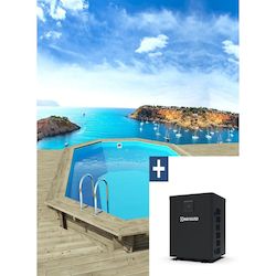 Kit piscine bois du Nord octogonale allongée - 4.86 x 3.36 x 1.30 m - Pin traité autoclave alte 4 FSC - 45mm - Liner Bleu pâle 75/100 ème - Filtration 4 m3/h - Margelle en pin - Feutre de fond et de parois - 1 sac de sable - Production Européenne + Pompe à chaleur 3.5 kw/h.