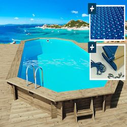 Kit piscine bois du Nord octogonale allongée - 7.57 x 4.07 x 1.31 m - Pin traité autoclave alte 4 FSC - Liner 75/100 ème - Filtration 8.3 m3/h - Margelle en pin - Feutre de fond et de parois - 3 sacs de sable - bâche à bulles 180 µ - bâche hiver 280 gr/m² - Production Européenne..