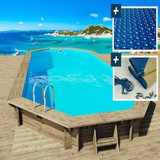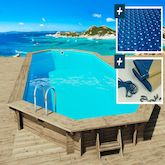 Kit piscine bois du Nord octogonale allongée - 8.57 x 4.57 x 1.45 m - Pin traité autoclave alte 4 FSC - Liner 75/100 ème - Filtration 8.3 m3/h - Margelle en pin - Feutre de fond et de parois - Bâche à bulles 180 µ - Bâche hiver 280 gr/m² - Production Européenne..