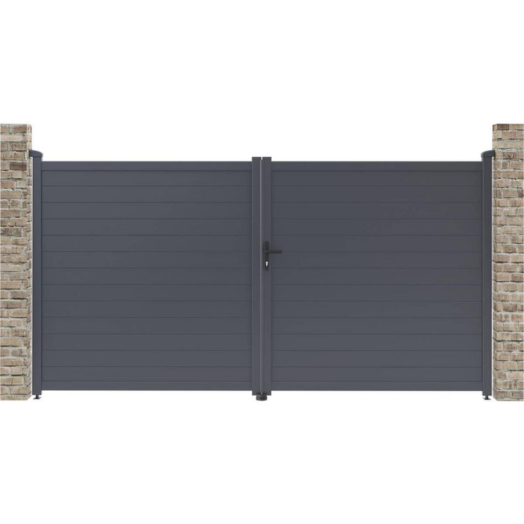 Portail aluminium  Marc  - Dimensions : 349.5 x 180.9 cm - Gris - Structure : aluminium - 2 portes avec serrure et poignée - Ancrages intérieurs et extérieurs - Anti-UV - Anti-rouille - Livré en kit - Piliers non inclus..