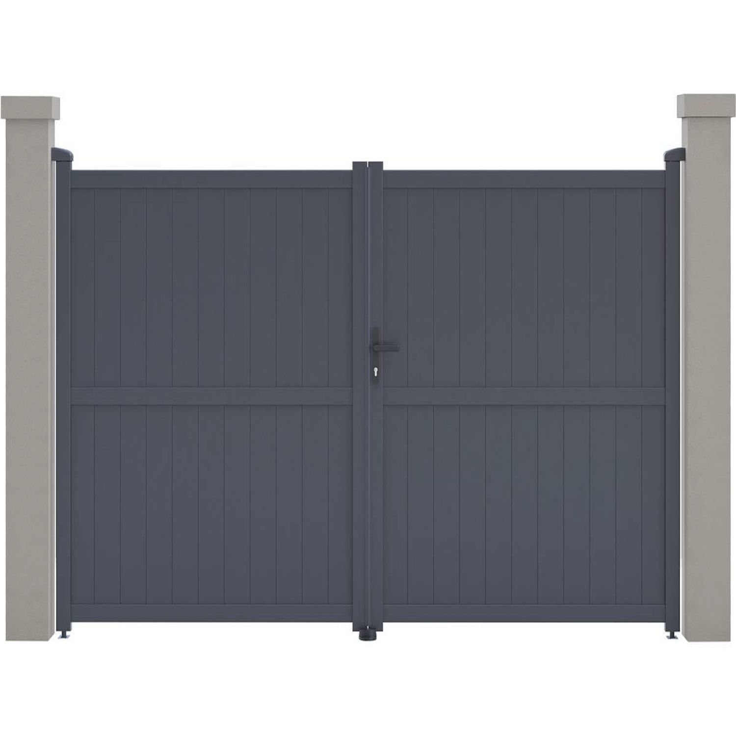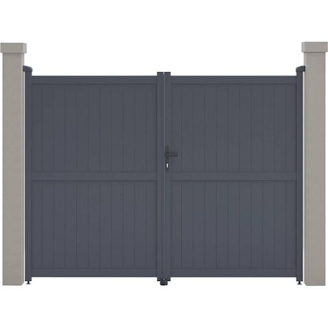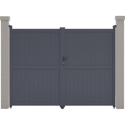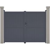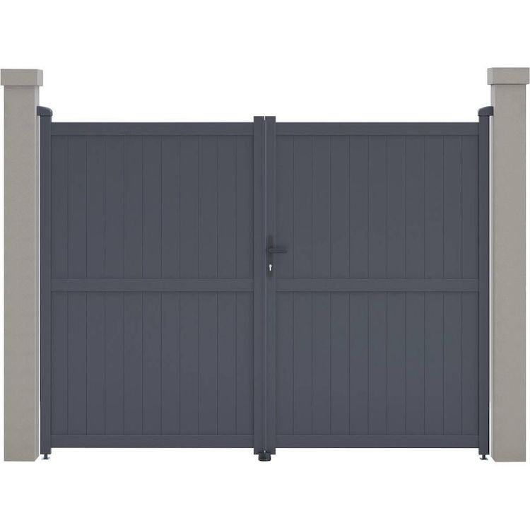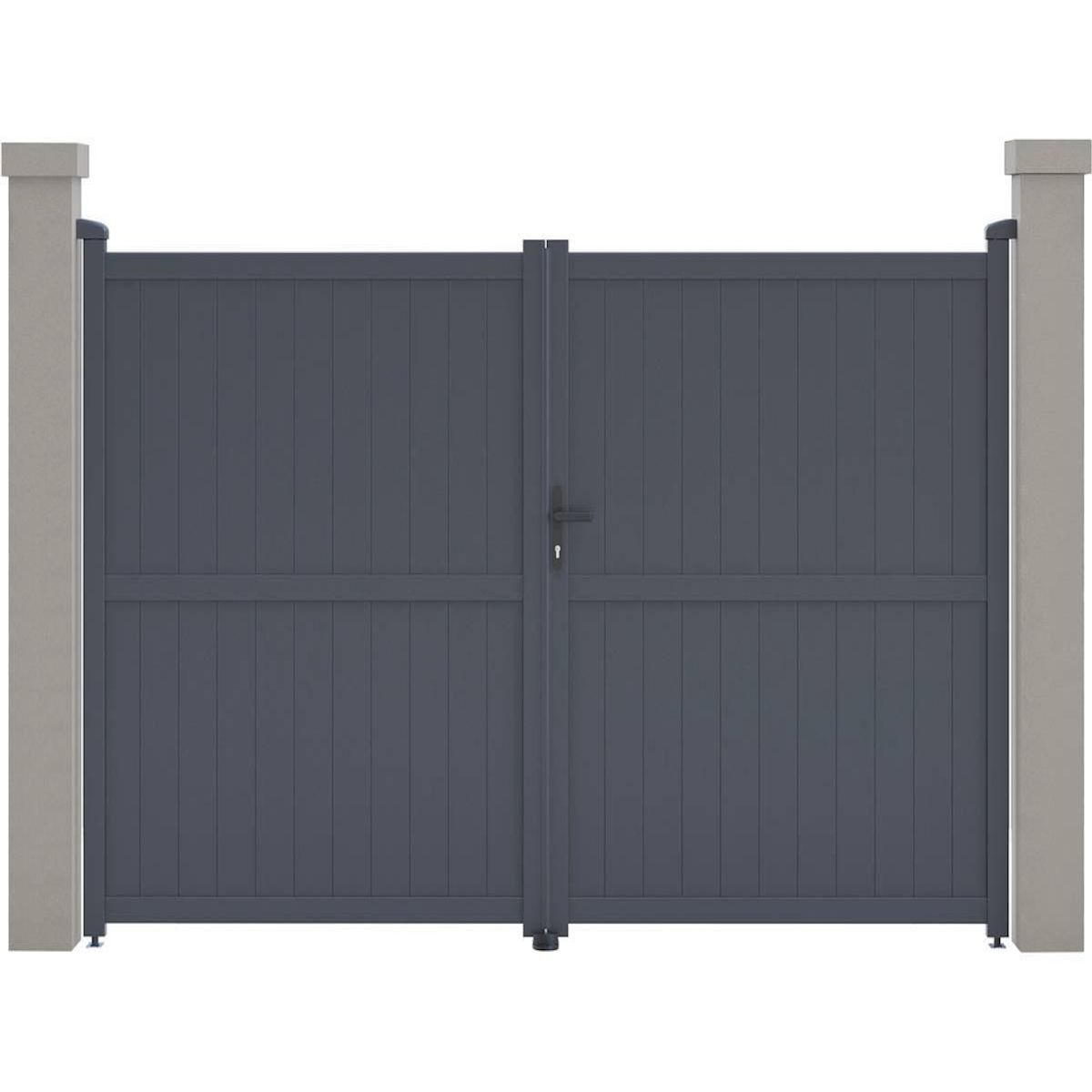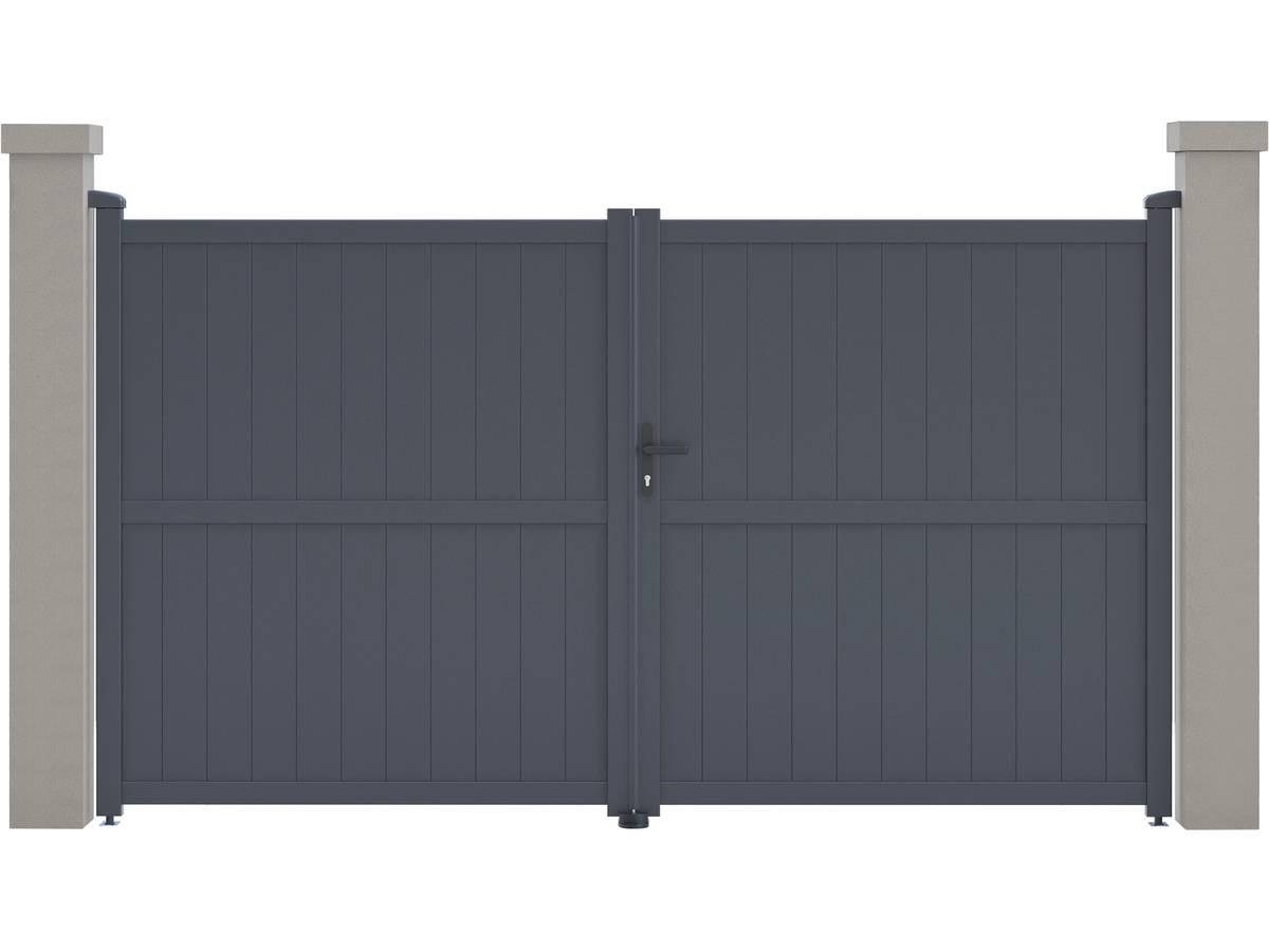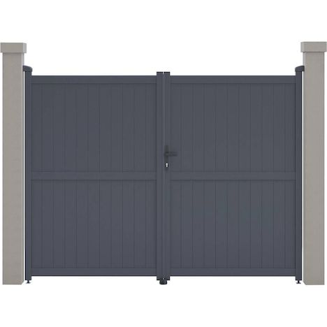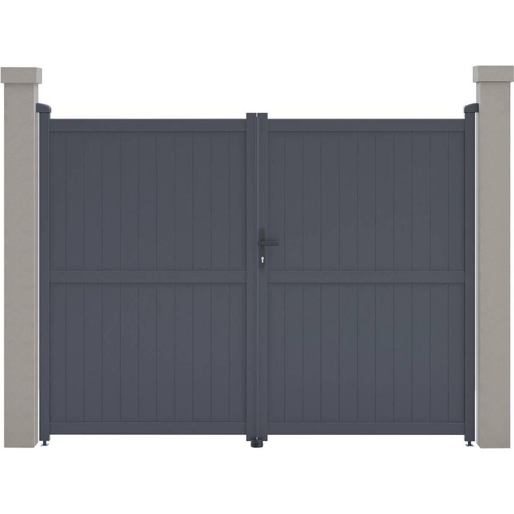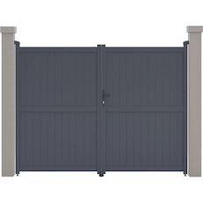 Portail aluminium Maurice Nous vous proposons le portail en aluminium Maurice . Il viendra apporter modernité et sécurité à votre entrée, il protègera votre habitation d'une manière optimale.Il est particulièrement résistants aux intempéries et nécessite peu d'entretien au quotidien. De plus il offre une parfaite tenue dans le temps, grâce à sa structure en aluminium et a une bonne résistance aux UV et a un traitement antirouille.Son design plein vous protègera du voisinage et des passants et préservera votre intimité des regards extérieurs. Portail aluminium Maurice - Dimensions : 299.5 x 155.9 cm - Gris - Structure : aluminium - 2 portes avec serrure et poignée - Ancrages intérieurs et extérieurs - Anti-UV - Anti-rouille - Livré en kit - Piliers non inclus. .Descriptif: Portail aluminium Maurice Vendu en kit Piliers non inclus