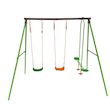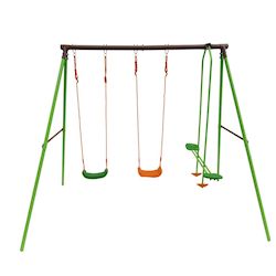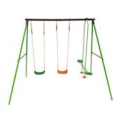 Portique en acier Léo - 3 agrès - 2 balançoires - 1 face à face - 297 x 156 x 196 cm - Coloris : vert, chocolat et orange.Le portique récréatif idéal Jouer entre amisAjoutez dans votre jardin une aire de jeu facilement grâce au portique pour enfants Leo !Idéale pour les beaux jours, cette aire de
