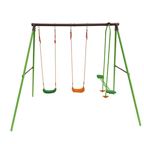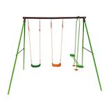 Le portique récréatif idéal Jouer entre amisAjoutez dans votre jardin une aire de jeu facilement grâce au portique pour enfants Leo !Idéale pour les beaux jours, cette aire de jeu amusera et divertira vos enfants de longues heures. Ils apprécieront s'y réunir avec leurs frères et soeurs mais aussi avec leurs amis, pour des après-midis des plus excitants !Vivre de formidables aventuresC'est pourquoi, le portique de jeu Leo leur propose 2 balançoires de 2 couleurs différentes ainsi qu'un agrès face à face à partir desquels ils pourront se balancer et vivre de belles aventures.Ce aire de jeu est construite en acier, solide, résistant et fiable ce qui vous permettra de l'utiliser sereinement.N'hésitez alors plus à leur offrir un véritable espace récréatif où ils pourront faire un peu de sport tout en s'amusant !Portique en acier Léo - 3 agrès - 2 balançoires - 1 face à face - 297 x 156 x 196 cm - Coloris : vert, chocolat et orange .Matériaux: Acier - PE - PP