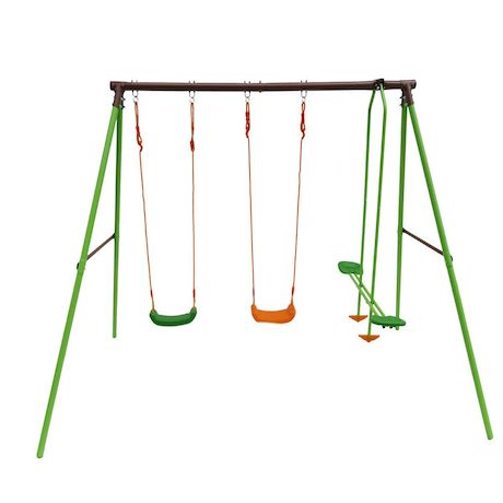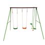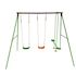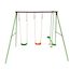 Portique en acier Léo - 3 agrès - 2 balançoires - 1 face à face - 297 x 156 x 196 cm - Coloris : vert, chocolat et orange.