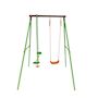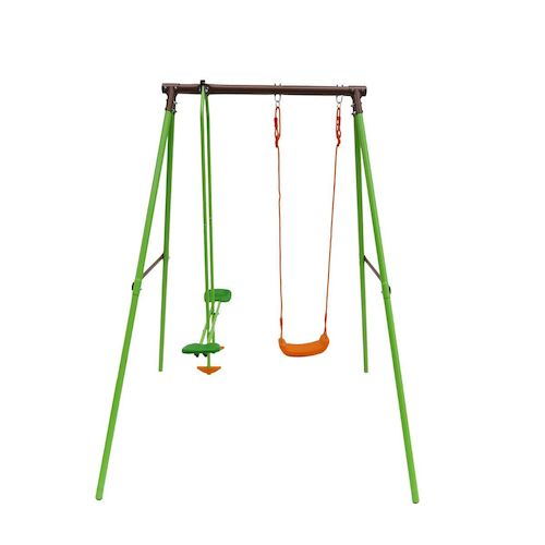Portique en acier Lola - 2 agrès - 1 balançoire - 1 face à face - 206 x 156 x 196 cm - Coloris : vert, chocolat et orange.
