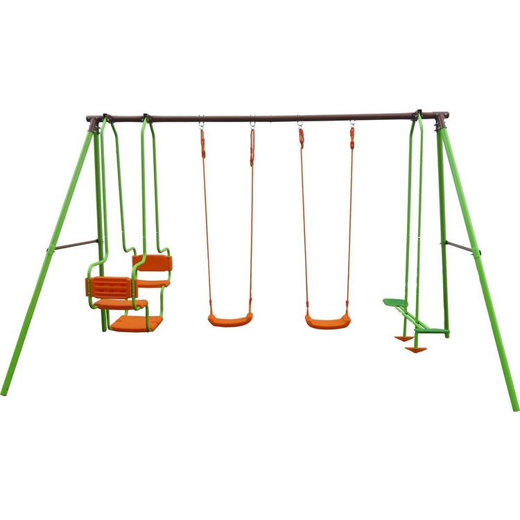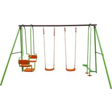 Portique en acier Mano - 4 agrès - 2 balançoires - 1 face à face - 1 balancelle - 384 x 168 x 220 cm - Coloris : vert, chocolat et orange.L'aire de jeux pour enfants de tous les loisirs Le jardin des enfants L'aire de jeux enfants Mano est une véritable cour de récréation pour tous les enfants. E