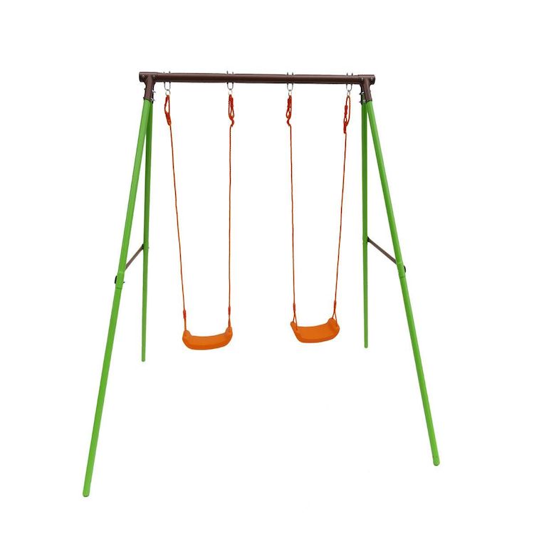 Portique en acier Polo - 2 agrès - 2 balançoires- 227 x 156 x 196 cm - Coloris : vert, chocolat et orange.Le portique en acier pour enfants !Vos enfants vont adorer s'amuser avec le portique Polo ! Du sport tout en s'amusantCette aire de jeu est parfaite pour les jeunes enfants et leur propose 2 b