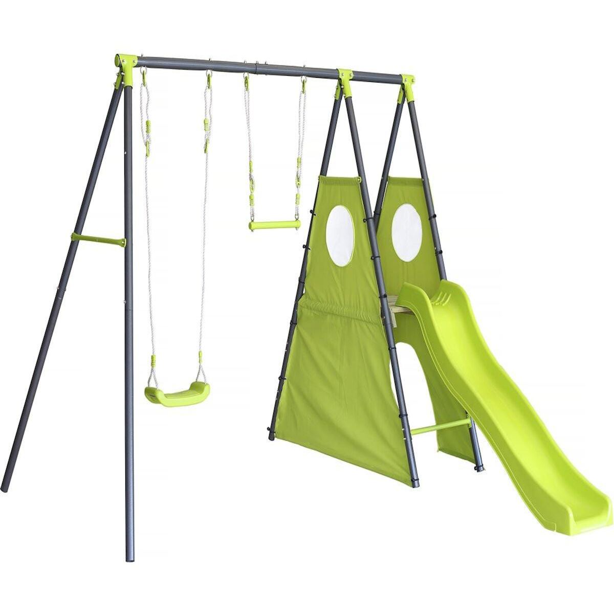 Balançoire en métal Kylian avec 4 agrès - Vert - Dimensions : 235 x 268 x 195 cm - 1 balançoire - 1 barre de trapèze - 1 toboggan - 1 tipi.