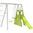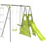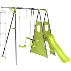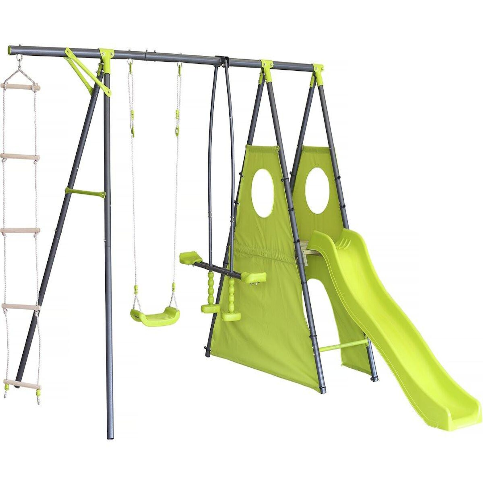 Balançoire en métal avec toboggan Dany avec 5 agrès - Vert - Dimensions : 285 x 268 x 195 cm - 1 balançoire - 1 balançoire vis à vis - 1 toboggan - 1 tipi - 1 échelle.