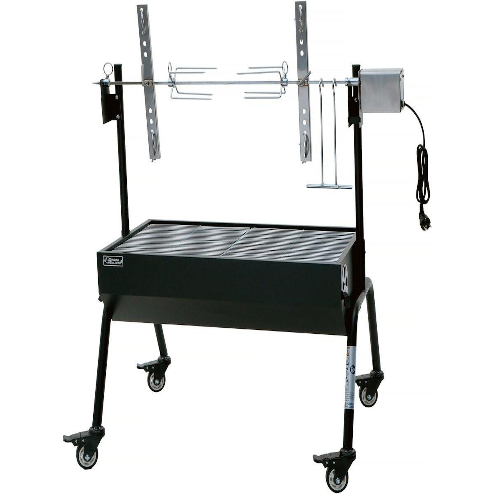 Barbecue à charbon / rôtissoire électrique avec cuve, broche et grille - 4 roues avec freins -Surface cuisson : 85 x 39.5 cm -Dimension du rôtissoire : 106 x 69 x 96 cm.