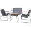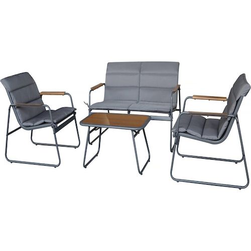 Salon de jardin matelassé en métal Bastia - 4 places - Dimensions canapé : 115 x 74 x 75 cm - Dimensions chaises : 61 x 74 x 75 cm - Dimensions table : 75 x 44 x 41 cm - Coussins en polyester 180g - Gris.