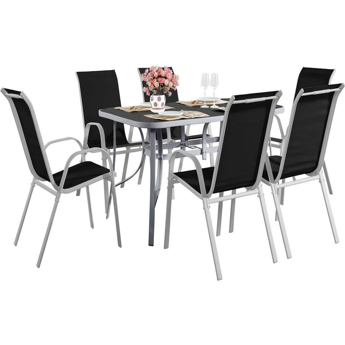Salon de jardin Cordoba + Phoenix – 6 places – Table 180 x 90 x 72 cmLe salon de jardin Cordoba + Phoenix est conçu pour offrir un espace extérieur confortable, convivial et élégant, idéal pour accueillir jusqu'à six personnes.Sa table en acier dotée d'un plateau en verre trempé de 180 x 90 x 72 cm assure une grande stabilité et une excellente résistance aux intempéries. Avec ses six fauteuils en aluminium et textilène noir, ce salon allie légèreté, robustesse et confort d'assise, tout en offrant un style moderne adapté à tous les types de terrasses ou jardins.Pratique, durable et esthétique, le salon de jardin Cordoba + Phoenix est la solution parfaite pour profiter pleinement de vos repas en plein air et créer un véritable espace de détente au quotidien.Salon de jardin Cordoba + Phoenix 6 places - Table acier / plateau verre 180 x 90 x 72 cm - 6 fauteuils aluminium / textilène noir. .Siège: Noir