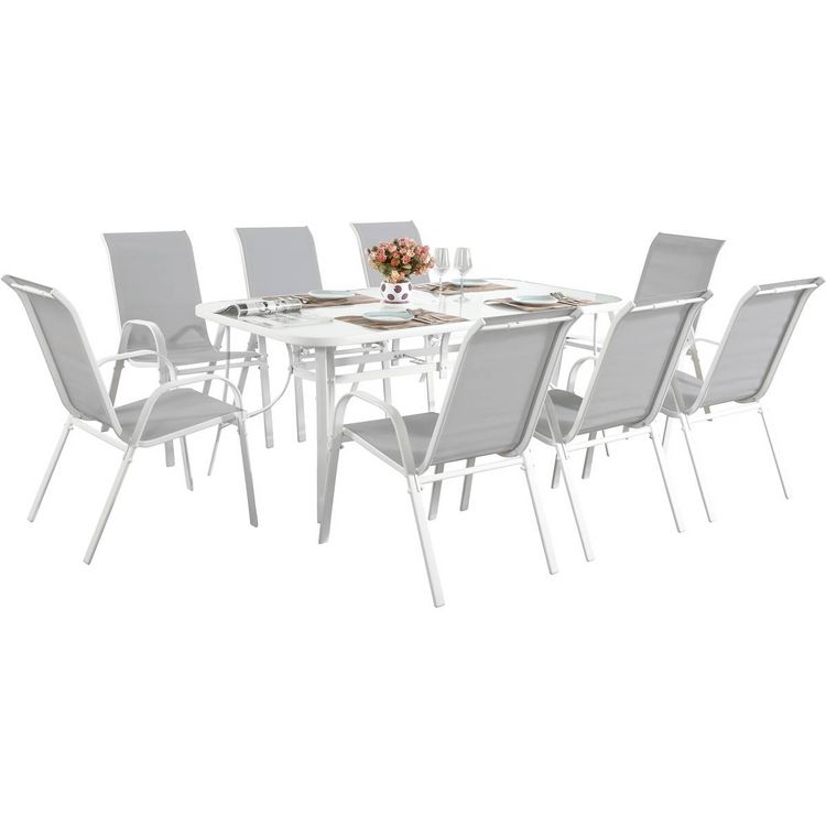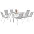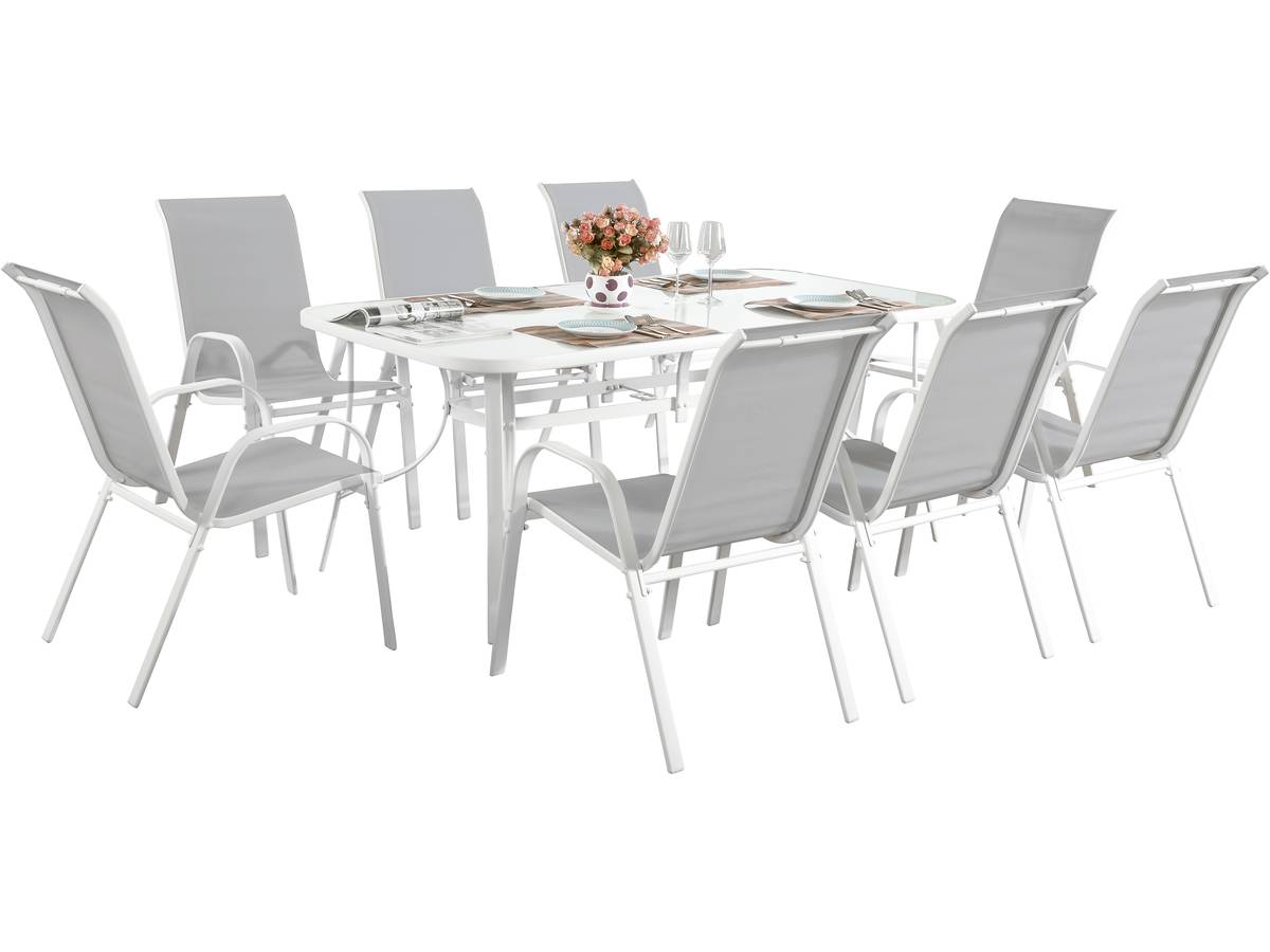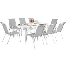 En savoir +Salon de jardin en textilène Cordoba - 1 table + 8 fauteuils - 180 x 90 x 72 cm - Couleur: Gris/Blanc.