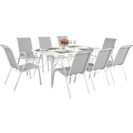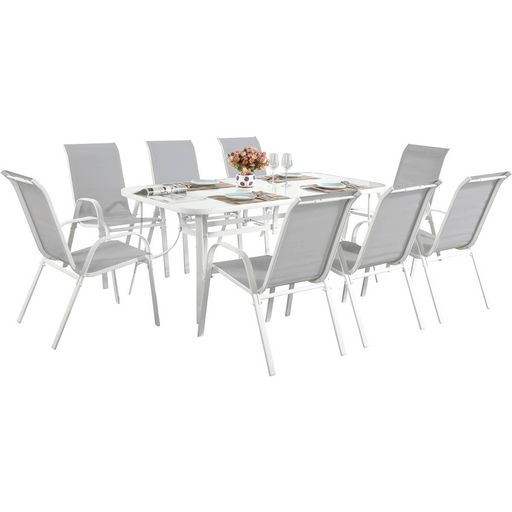 Salon de jardin en textilène Cordoba - 1 table + 8 fauteuils - 180 x 90 x 72 cm - Couleur: Gris/Blanc. : Salon repas de jardin, structure en acier et assise en textilène - Idéal pour recevoir vos proches et vos amis autour d'un repas. Ce salon se veut moderne, fonctionnel mais surtout convivial. L