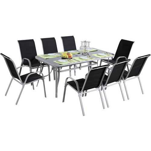 Salon de jardin en textilène Cordoba - 1 table + 8 fauteuils - 180 x 90 x 72 cm - Couleur : Noir. : Salon repas de jardin, structure en acier et assise en textilène - Idéal pour recevoir vos proches et vos amis autour d'un repas. Ce salon se veut moderne, fonctionnel mais surtout convivial. L'idée