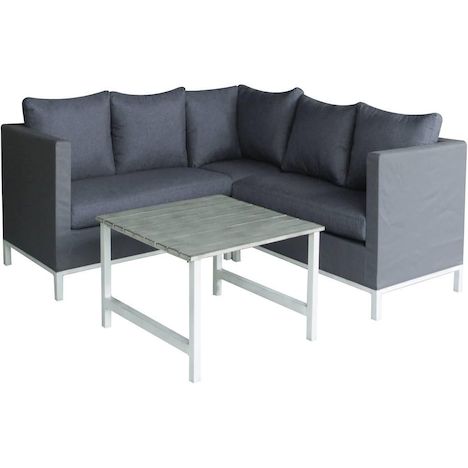 Donnez le tonPoint de mire de votre jardin, le canapé d'angle Turin sera au centre de toutes les attentions cet été !Pièce maîtresse, il donnera le ton à votre jardin, pour un jardin chic et tendance.Vous aimez recevoir ? Le canapé d'angle est fait pour vous !Vous invités seront bien accueillis dans ce large canapé et apprécieront le confort des coussins du dossier. Struture en aluminumRésistant à la rouille, ce salon se veut durable et robuste. En effet, sa structure est entièrement constituée d'aluminium.De plus en plus populaire, l'aluminium se retrouve dans de très nombreux mobiliers de jardin.En plus d'être moderne et épuré, l'aluminium est à la fois très résistant et léger, vous déplacerez facilement votre mobilier de jardin.Enfin matériau propre, l'aluminium est très simple d'entretien et se recycle en fin de vie. Transformez votre jardin !N'hésitez pas à faire de cet espace un véritable coin lounge où passer vos après-midis et où finir vos soirées. Pour rendre ce salon de jardin encore plus chaleureux et confortable, vous pouvez l'agrémenter d'un parasol droit ou déporté, de bains de soleil à placer à côté ou avec n'importe quel autre mobilier de jardin de votre choix. Et pensez également à l'éclairage ! Pour ne pas passer la soirée dans l'obscurité, optez pour les éclaires de jardin LED qui vous offriront une ambiance tamisée pour vos fins de soirées. Comment entretenir son salon de jardin ?Parce que la structure du salon Turin est en aluminium, son entretien est simple et rapide. Pour nettoyer ce salon de jardin, vous aurez uniquement besoin d'eau savonneuse et d'un chiffon ou d'une éponge propre.Préférez les produits sans solvants ou encore les chiffons (ou éponges) non abrasifs pour ne déteriorer ni rayer la structure du salon.Même s'il est résistant à la rouille, n'hésitez pas à ranger votre salon sous une housse de protection et à l'entreposer à l'abri en cas d'intempéries.Salon de jardin - Canapé d'angle - Table basse - Structure en aluminium - Coussins assises/dossier en polyester - Déhoussables et Lavables - Résiste à la rouille - 219 x 83/219 x 70 cm - Gris .Descriptif: - Salon de jardin - Un canapé d'angle et sa table basse carré - Grande capacité d'accueil - 219 x 83/219 x 70 cm - Élément d'angle : 83 x 83 x 70 cm - Élément assise 2 place : 136 x 83 x 70 cm - Structure en aluminium - Assise et coussins en polyester - Coussins déhoussables et lavables