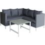 En savoir +Salon de jardin - Canapé d'angle - Table basse - Structure en aluminium - Coussins assises/dossier en polyester - Déhoussables et Lavables - Résiste à la rouille - 219 x 83/219 x 70 cm - Gris.